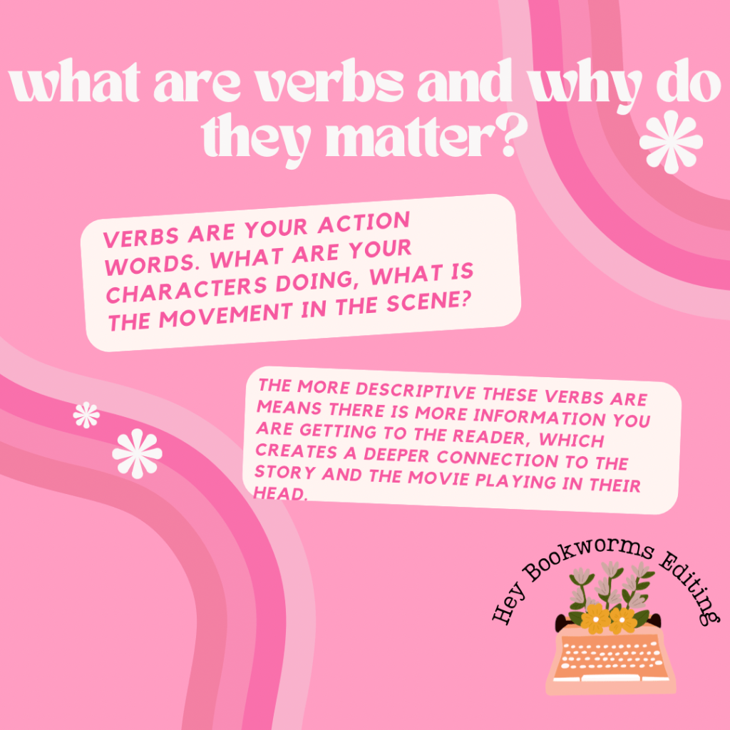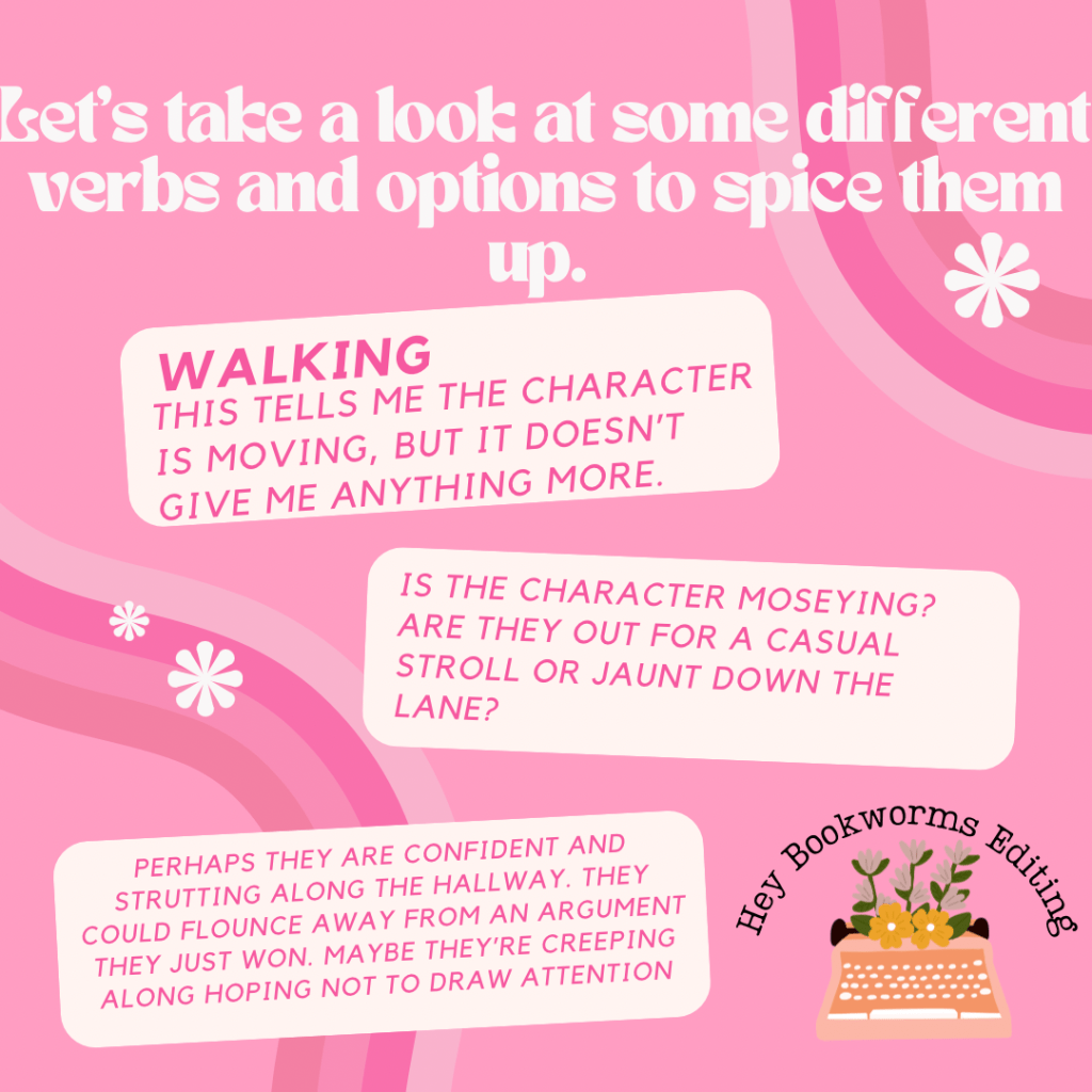 Using descriptive and vivid verbs helps to ensure that there is dynamic movement and a deeper connection between what your characters are doing and what your reader is seeing in their head. Without verbs, you will have wonderful characters that are mimicking Sims characters that stand around without anything to do.